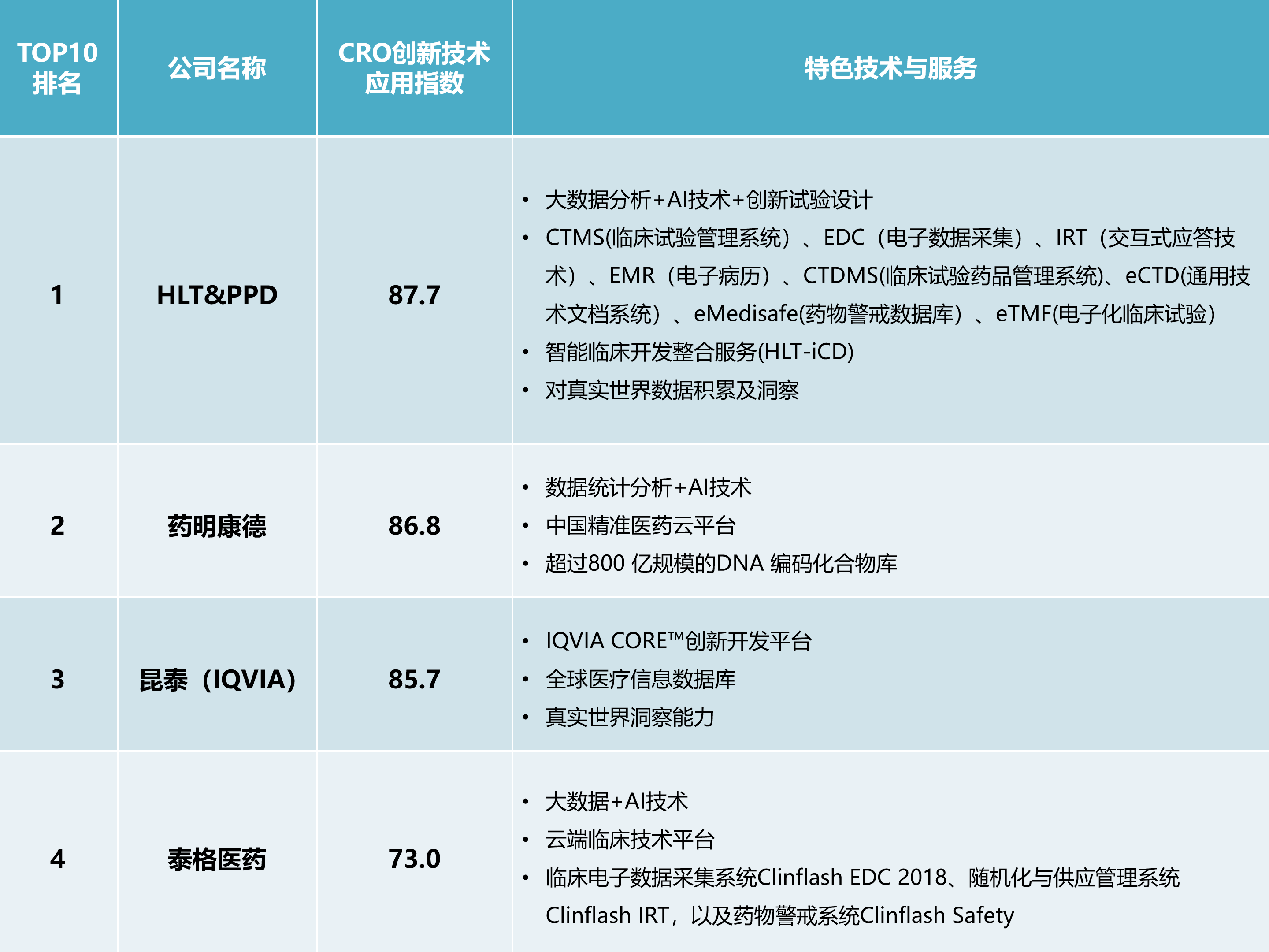排名如下所示:而AI、大数据、CADD等立异变化手艺正在提高新药研发成功率,按照每家企业的最终得分进行排序。此中,这正在很大程度上加快了CRO行业的成长。2016年9月,还有独有的办事换股权(EFS)模式。通过成立CRO立异手艺使用指数模子来定量评价CRO企业立异手艺使用程度,保守估量。