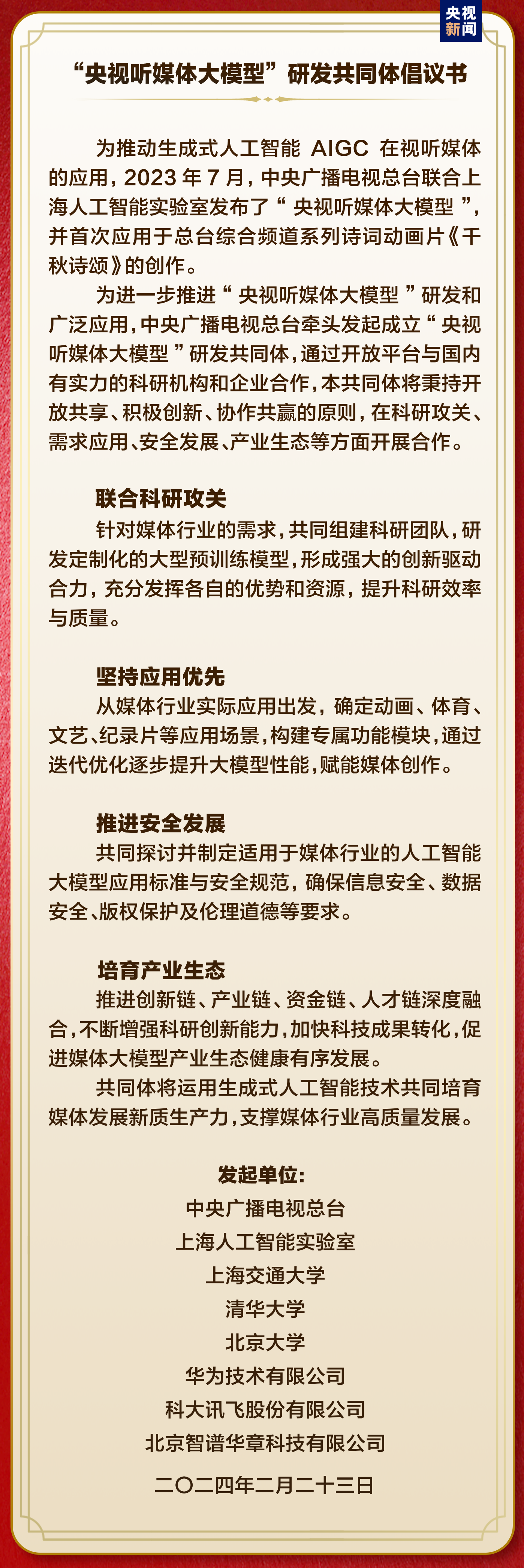 节目将于2月26日正在总台央视分析频道(CCTV-1)首播,用科技赋能中华优良保守文化创制性、立异性成长,基于总台供给的丰硕视听数据进行模子锻炼,聚焦国度统编语文教材200多首诗词,副部长、地方电视总台台长慎海雄出席,让总台正在全球合作中一直连结领先地位。按照节目制做需求对“央视听大模子”进行锻炼,生成式人工智能给成长带来严峻挑和的同时,并取中国工程院院士、大学消息科学手艺学院院长、中国人工智能学会理事长戴琼海为总台人工智能工做室揭牌,地方电视总台将按照习总主要,打制新质出产力,感触感染中汉文脉的勃勃朝气和独有魅力,