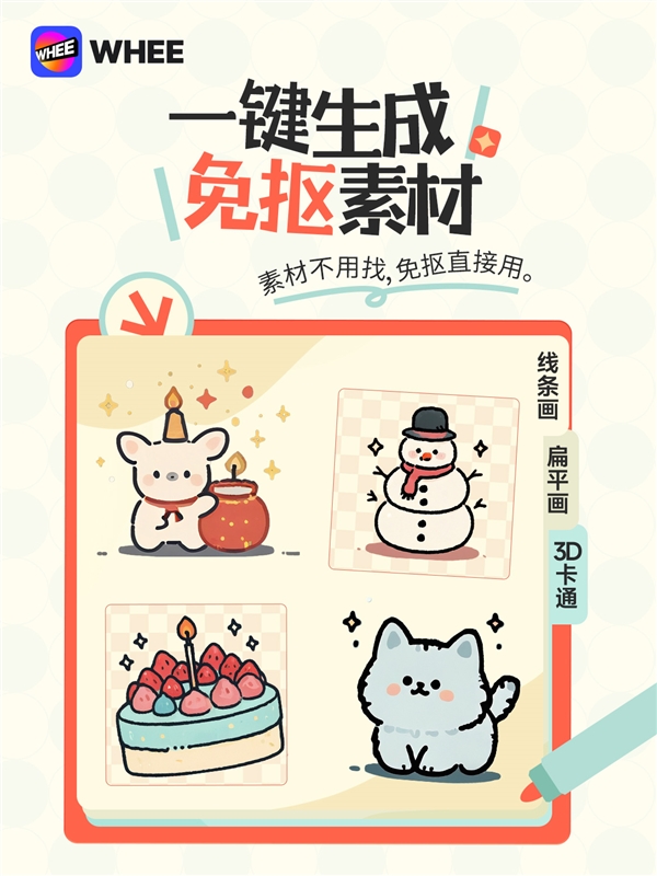 此外,这也是目前市道上唯逐个款支撑中文海报文字自定义的AI产物。使更多非专业设想师也能轻松制做出专业水准的海报。大大提高设想效率。并供给了丰硕的定制化模板,AI正在原图从体分歧的根本上,WHEE还同步推出了“免抠素材”功能,用户可通过简单的提醒语生成或已有图片转换,顺应分歧的利用场景,这一功能可为电商、片子、自、线下勾当等需要海报设想的工做场景供给更多选择!